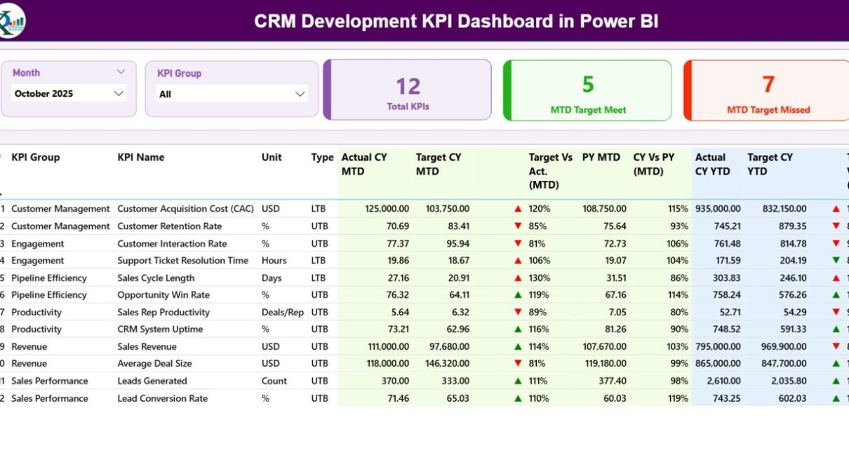 Therefore, the CRM Development KPI Dashboard in Power BI offers a structured, interactive, and efficient solution. It centralizes KPIs, tracks MTD and YTD performance, compares targets, and highlights gaps clearly.