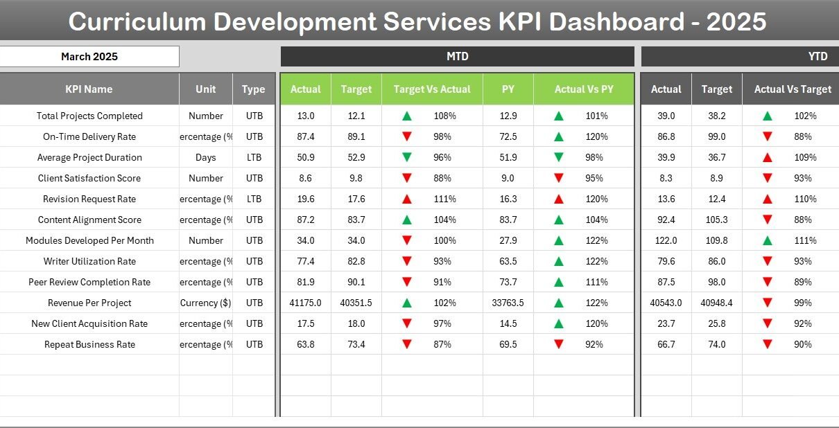 The core component of the dashboard, this sheet summarizes all KPIs for your curriculum development projects.