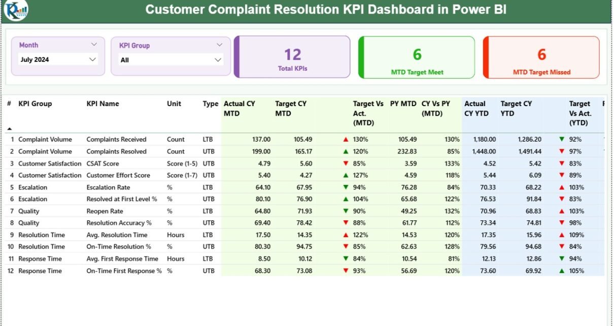 - KPI Group – Category of the KPI such as Response Time, Complaint Volume, or Resolution Rate.