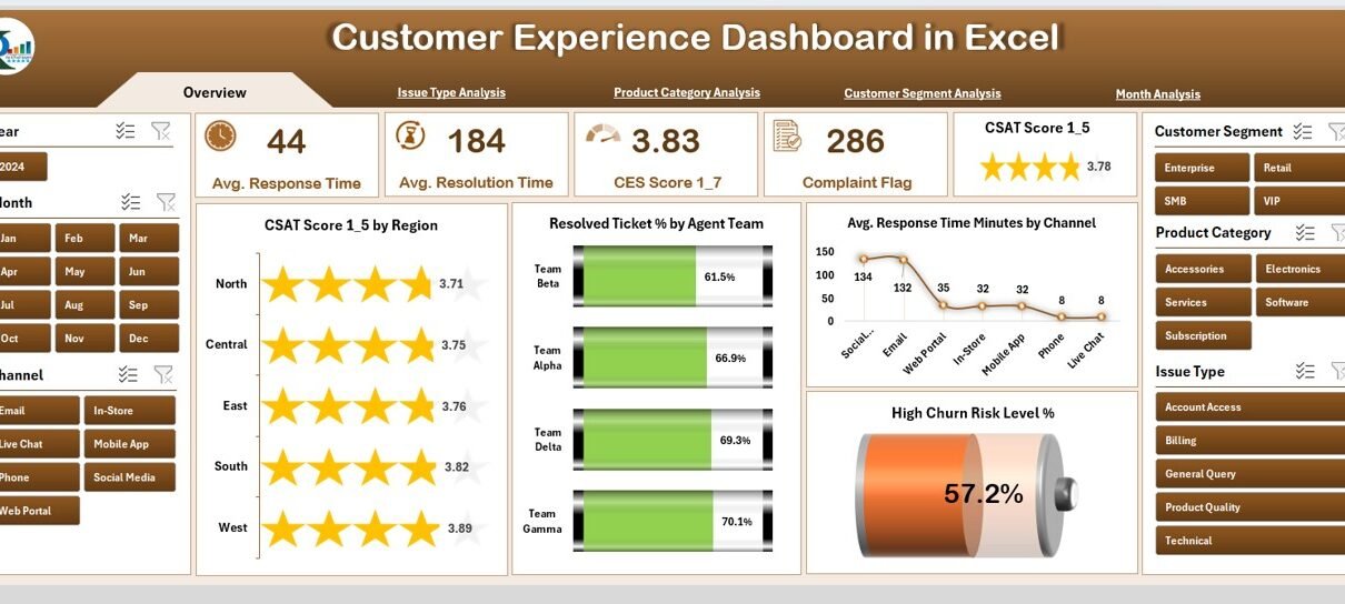 A Customer Experience Dashboard in Excel is a smart tool that displays all customer support and satisfaction metrics visually. It turns raw customer service data into clear charts, cards, and tables. This helps teams quickly monitor CSAT scores, response times, ticket resolution, churn risk, and customer feedback patterns.