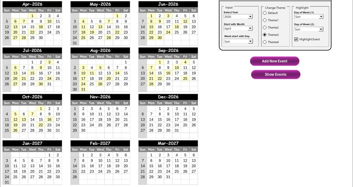 The Annual View sheet includes a powerful Control Panel that allows users to customize the calendar easily.