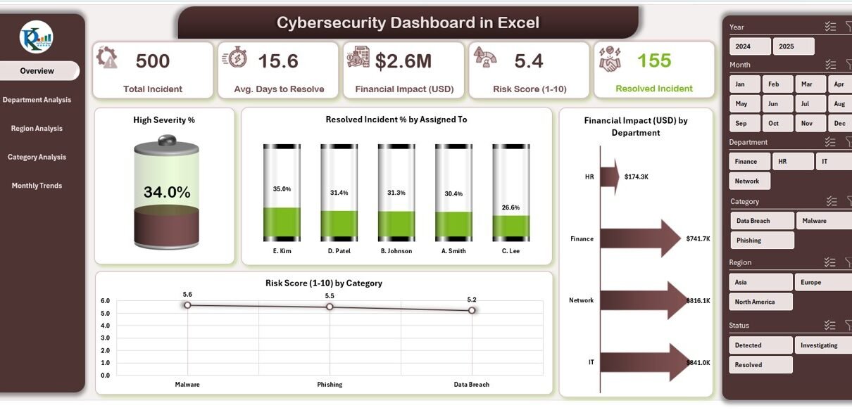 A Cybersecurity Dashboard in Excel is a comprehensive visual tool designed to monitor an organization’s cybersecurity posture. It compiles key metrics such as incident severity, resolution rate, financial impact, and risk score into interactive visuals and charts.