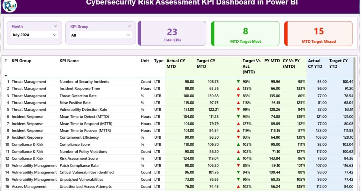 The Cybersecurity Risk Assessment KPI Dashboard in Power BI tracks any cyber risk KPIs you define in the Excel KPI Definition tab — typical examples include vulnerability remediation rate, mean time to detect (MTTD), mean time to respond (MTTR), patching SLA compliance, phishing test failure rate, and security training completion rate.