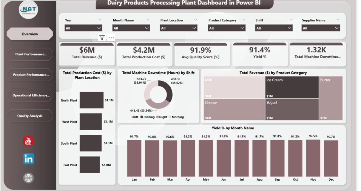 The Dairy Products Processing Plant Dashboard in Power BI provides a complete business intelligence solution for dairy manufacturing companies.