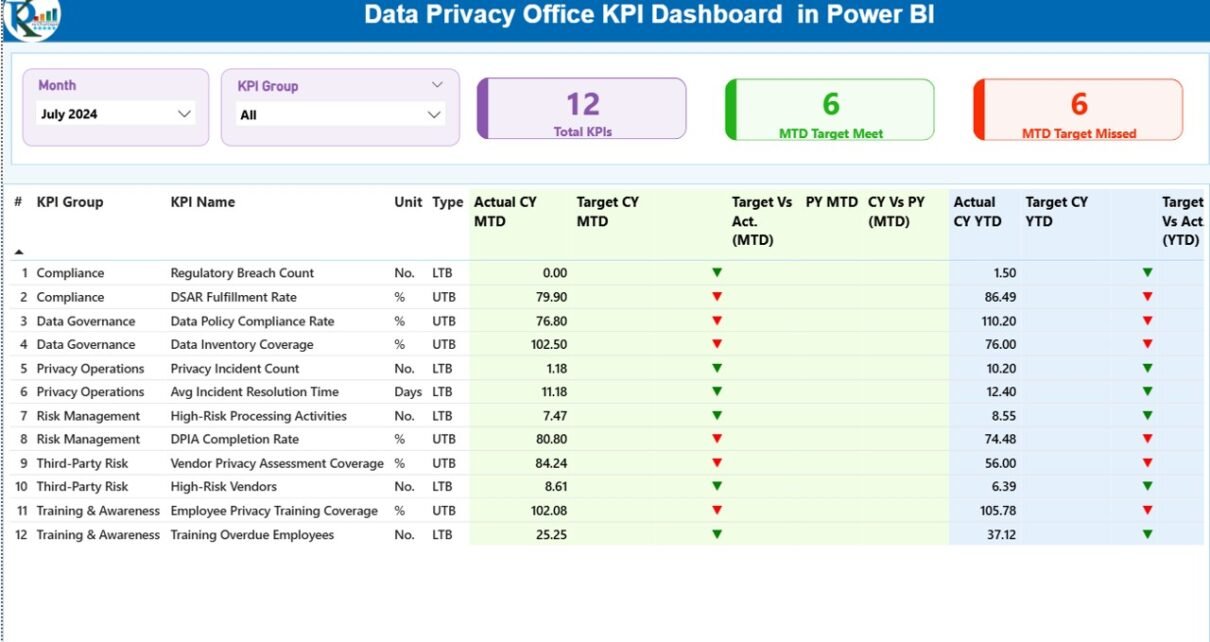 Instead of reviewing long spreadsheets or manual reports, this dashboard converts raw KPI data into clear visuals, trend analysis, and status indicators. As a result, data privacy leaders can monitor performance in real time and act before risks grow.