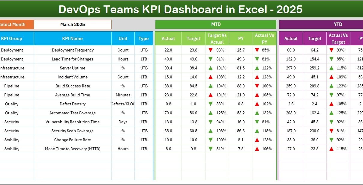 This ready-to-use dashboard centralizes DevOps metrics, tracks performance month by month, and compares Actual vs Target and Previous Year numbers. Moreover, it helps engineering managers, CTOs, and DevOps leaders make faster decisions with confidence.