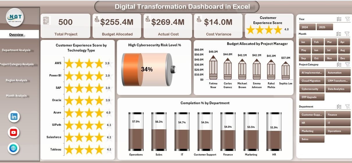 This ready-to-use dashboard gives leaders complete visibility into transformation projects. Moreover, it converts raw data into clear, interactive insights. As a result, decision-makers can track performance, control budgets, and improve customer experience without wasting time.