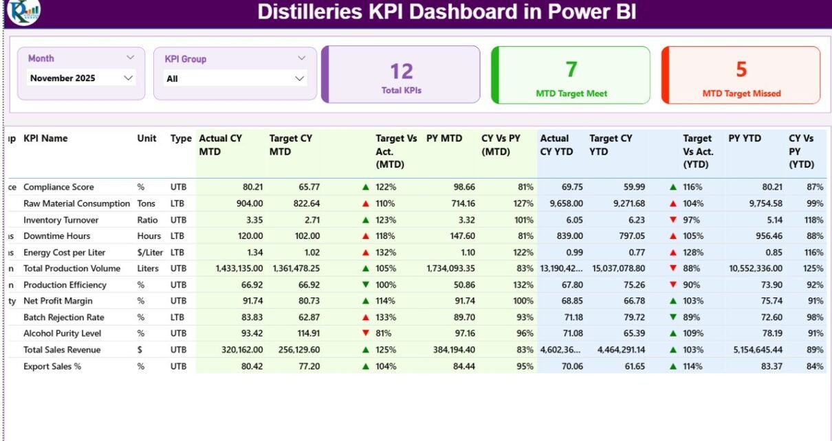 A Distilleries KPI Dashboard in Power BI is a structured performance monitoring system built inside Microsoft Power BI. It helps you track key performance indicators related to production, yield, losses, quality, finance, and compliance.
