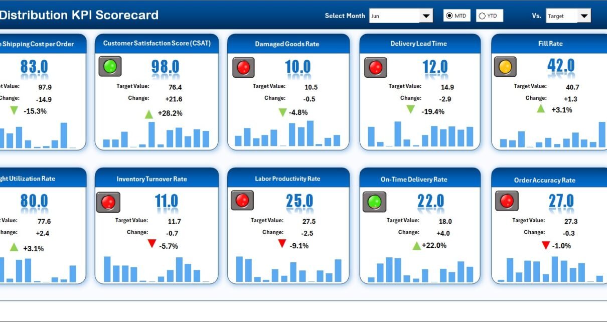 That’s where the Distribution KPI Scorecard in Excel comes in — a powerful, ready-to-use template designed to track, analyze, and visualize key performance indicators (KPIs) for distribution operations.