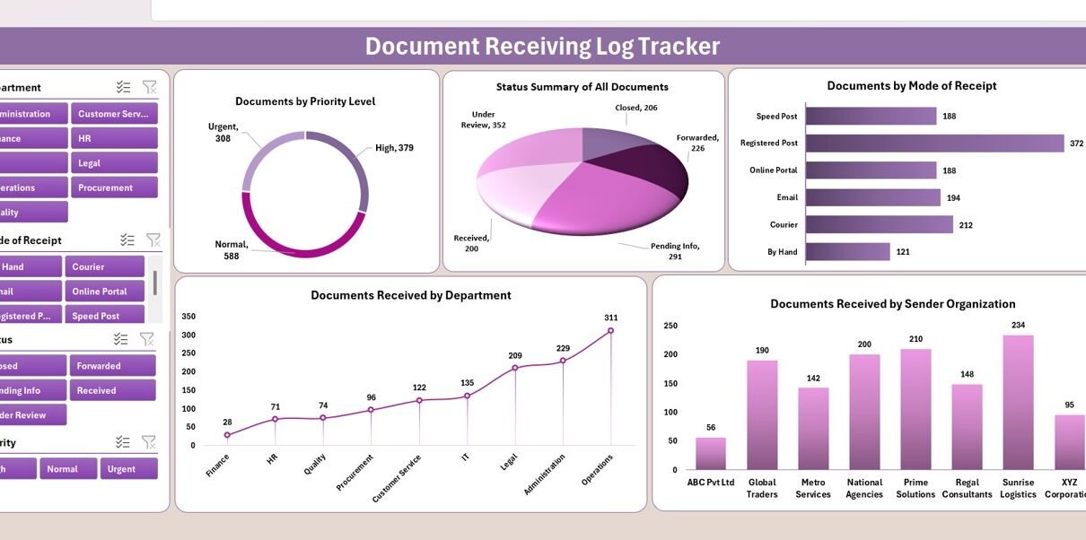 The Dashboard Sheet turns your document data into clear, visual insights. It includes five interactive slicers to analyze records quickly: