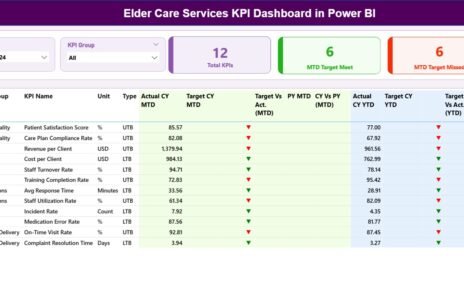 - Interactive Summary Page: The main page includes slicers for Month and KPI Group, offering easy customization to view data by specific timeframes and categories. Key information like total KPIs, MTD targets, and status indicators (using red/green icons) are all available for quick analysis.