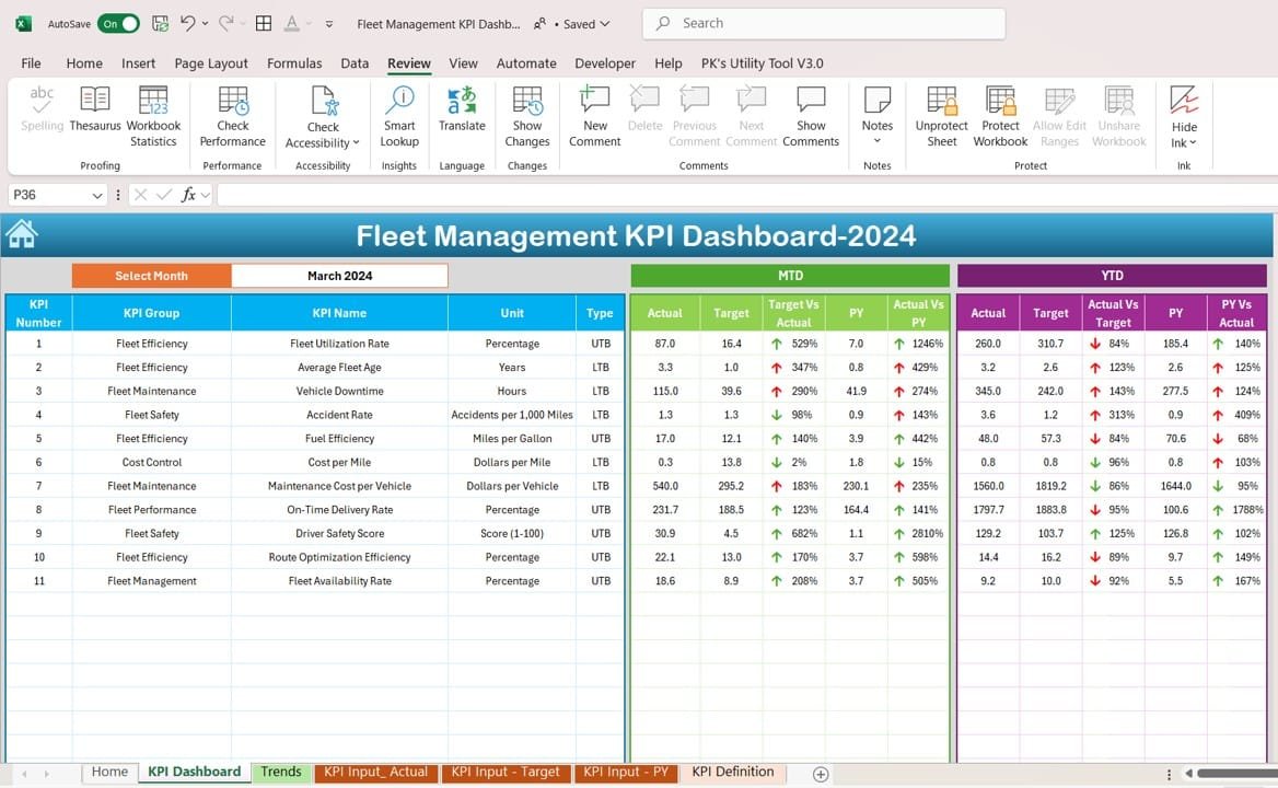 - Target Sheet Tab: Lets fleet managers enter target values for each KPI, ensuring benchmarks are met.
