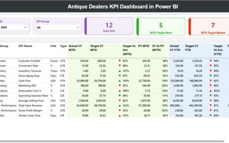 • Dashboard Sheet Tab: Displays essential KPI data, such as MTD (Month-to-Date) and YTD (Year-to-Date) figures, with real-time updates and visual performance indicators.
