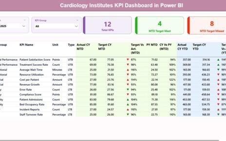 The Dashboard Sheet displays vital data, including MTD (Month-to-Date) and YTD (Year-to-Date) values for each KPI. This sheet provides comparisons between current performance, targets, and previous year data, with clear visual indicators (up/down arrows) to highlight performance trends.