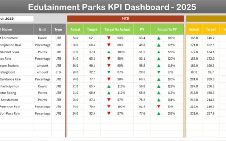 • Input and analyze MTD and YTD actuals, targets, and historical data in dedicated tabs, with conditional formatting to highlight performance against benchmarks.