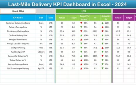 • This sheet outlines each KPI in detail, including the KPI name, group, unit, formula, and definition. It provides transparency and ensures consistent data usage across the organization.