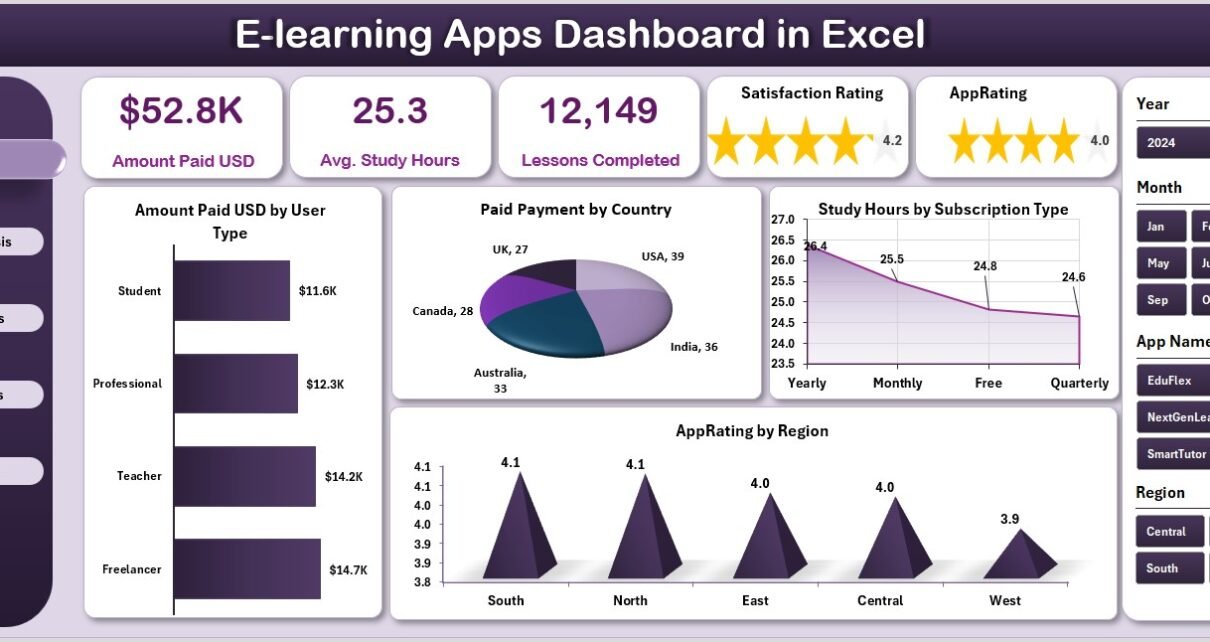 An E-Learning Apps Dashboard in Excel is a dynamic reporting and analytics solution that consolidates all learning-related data — from user engagement to financial transactions — into one interactive workspace.