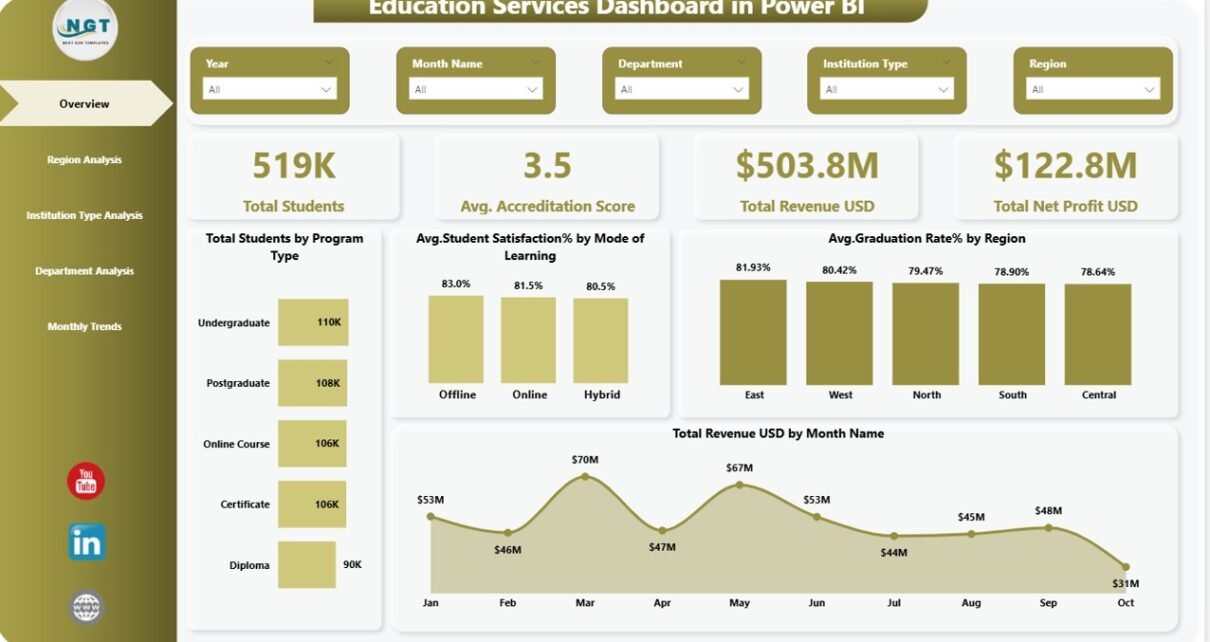 The Education Services Dashboard in Power BI transforms how educational institutions analyze performance. Instead of relying on manual reporting, organizations gain interactive, real-time insights across students, departments, finances, and regions.