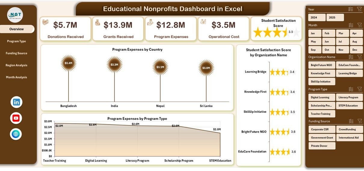 The Educational Nonprofits Dashboard in Excel provides a structured, user-friendly, and powerful solution for tracking programs, funding, expenses, and satisfaction metrics. By combining interactive visuals with centralized reporting, the dashboard transforms complex data into actionable insights.