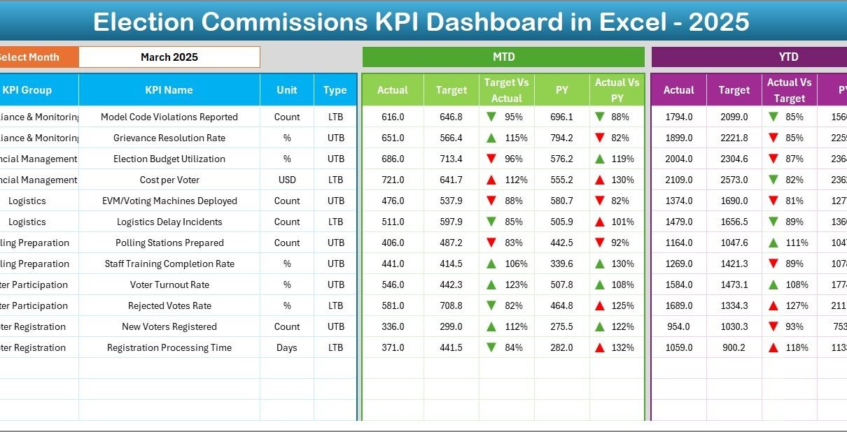 The Election Commissions KPI Dashboard in Excel provides a structured, interactive, and transparent solution. It helps authorities track MTD and YTD performance, compare results with targets, and analyze trends across months.