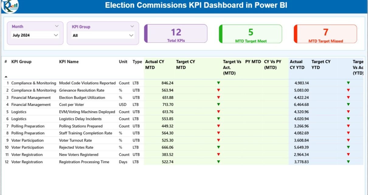 Instead of checking multiple spreadsheets, election authorities can analyze everything in one interactive dashboard. Furthermore, users can filter results by month and KPI group. Therefore, teams gain clear insights into both MTD (Month-To-Date) and YTD (Year-To-Date) performance.