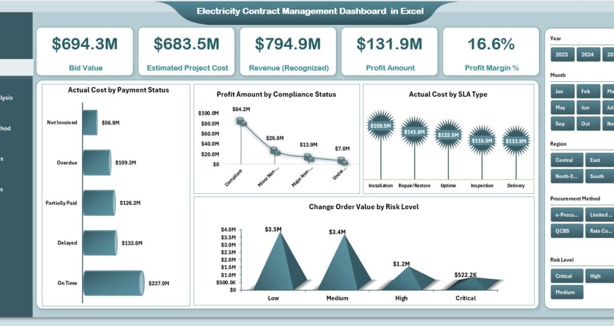 It is an Excel-based dashboard that tracks financial, operational, and compliance performance of electricity contracts.