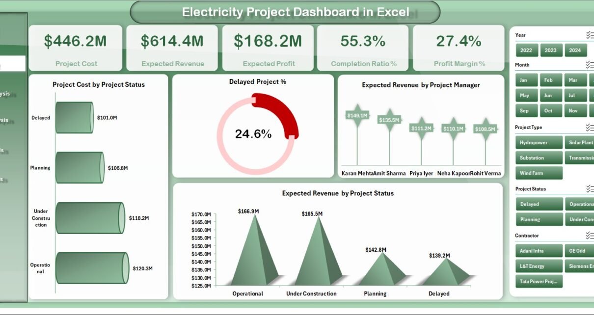 An Electricity Project Dashboard in Excel is an analytical reporting tool that tracks project cost, revenue, completion progress, and contractor performance.