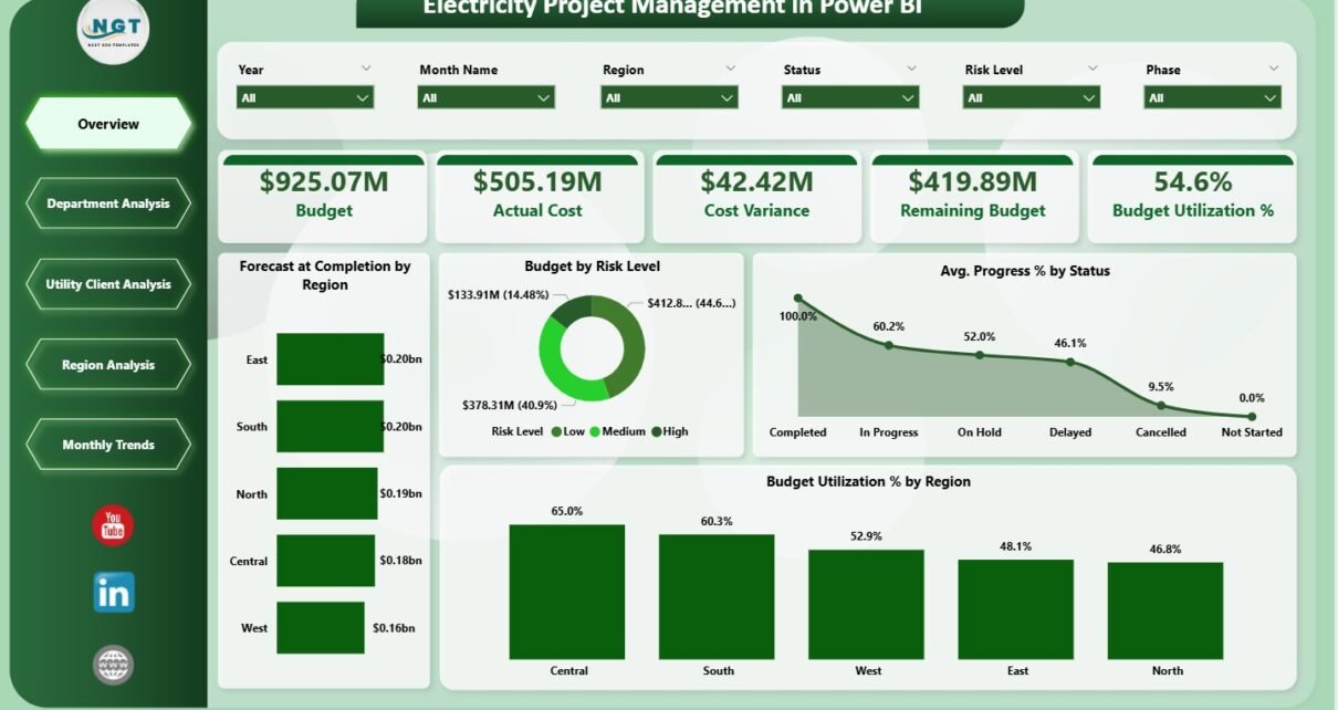 An Electricity Project Management Dashboard in Power BI transforms complex project data into clear and actionable insights. It helps organizations control budgets, monitor costs, forecast completion, and analyze performance across departments, regions, and clients. Moreover, its interactive structure empowers teams to act quickly and confidently.