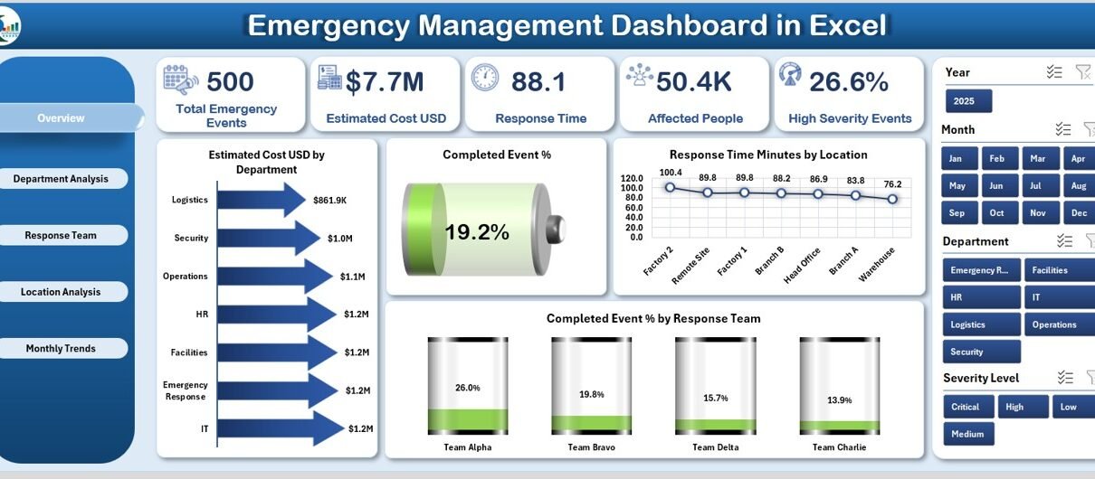 Excel is one of the most accessible and flexible tools for building analytical dashboards. Here’s why it’s ideal for emergency management: