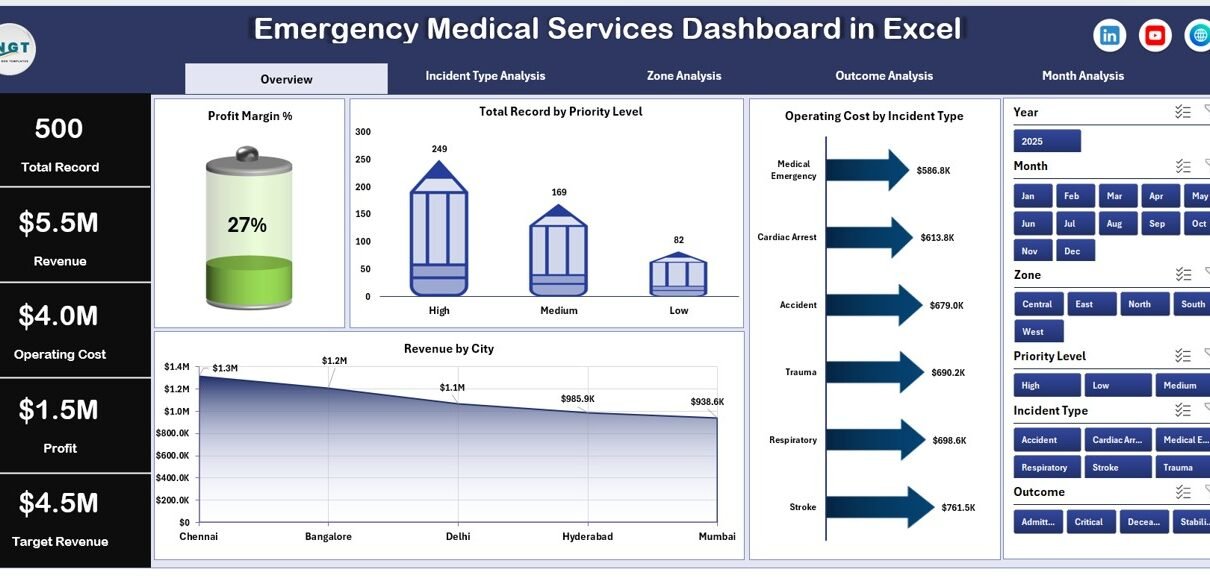 An Emergency Medical Services Dashboard in Excel is an interactive analytical tool designed to monitor emergency response operations, incident performance, operational costs, and revenue outcomes.