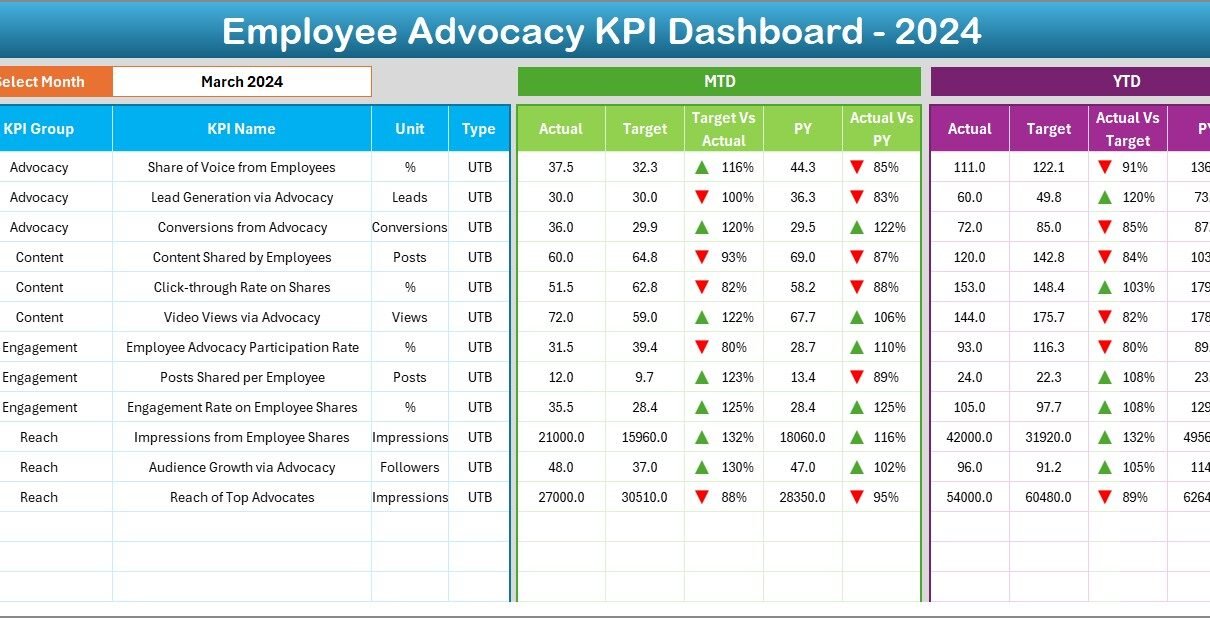 An Employee Advocacy KPI Dashboard in Excel is a structured tool that allows businesses to track, measure, and analyze advocacy efforts by employees. It provides a centralized view of KPIs, enabling managers and teams to see how their advocacy activities perform against defined targets.