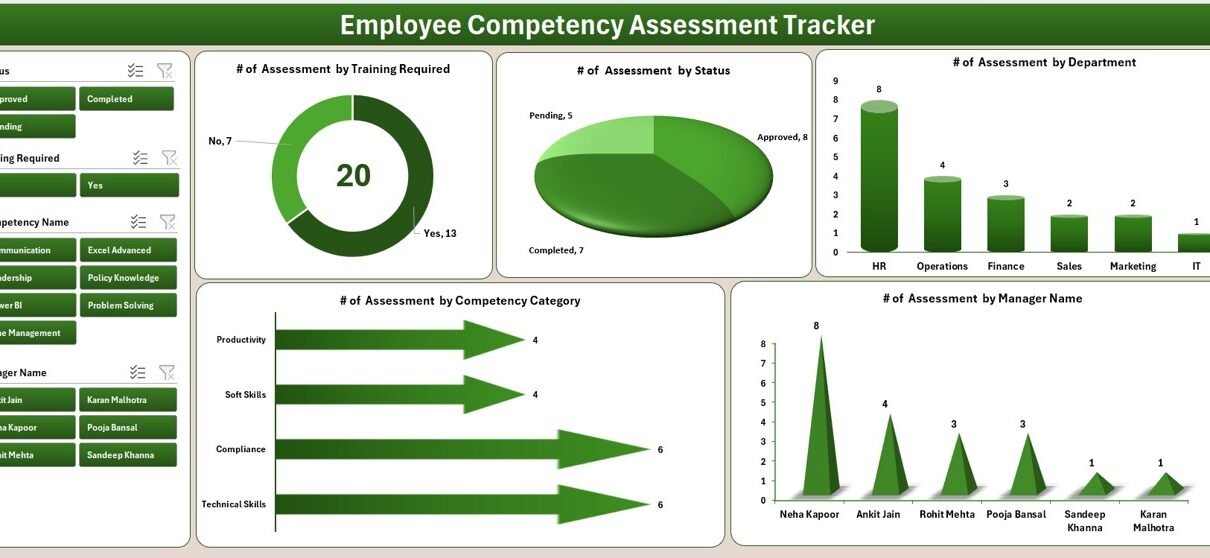 The Dashboard sheet provides a visual overview of competency assessment data. Managers can instantly analyze performance using charts and slicers.