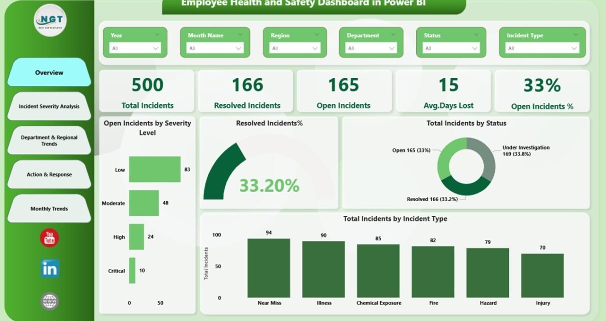 This Employee Health and Safety Dashboard includes five structured pages, each designed to answer specific safety-related questions. Let’s explore each page in detail.