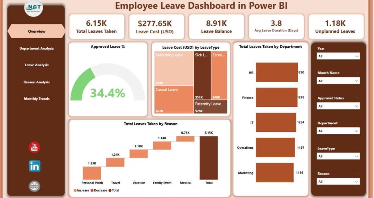 The dashboard has five pages: Overview, Department Analysis, Leave Analysis, Reason Analysis, and Monthly Trends.