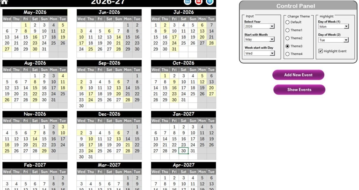 The Home sheet works as the index page of the calendar. It allows users to quickly navigate to different sections of the workbook.