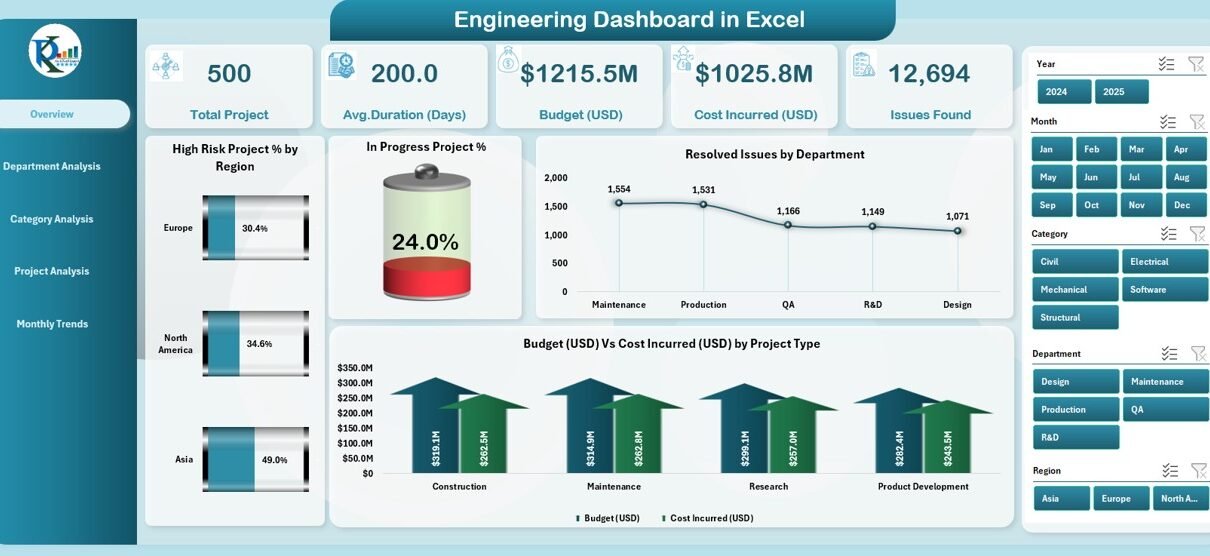 An Engineering Dashboard in Excel is a prebuilt analytics tool that helps engineers, managers, and executives visualize key performance indicators (KPIs) related to project execution, department performance, issue tracking, and budget utilization.