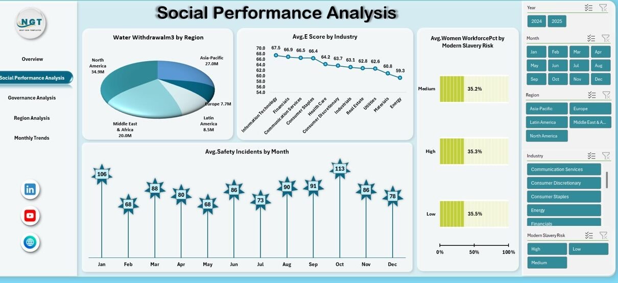A ready-to-use Environmental, Social, and Governance (ESG) Dashboard in Excel includes multiple structured sheets. Each sheet focuses on a specific analytical view.