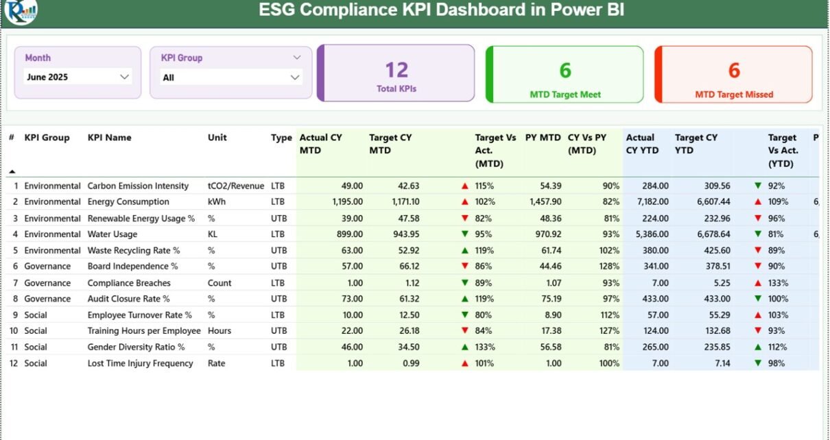 Instead of reviewing static ESG reports or Excel files, this dashboard converts ESG data into real-time insights. Moreover, it displays key ESG indicators such as MTD, YTD, target achievement, and year-over-year performance in a single, unified view.