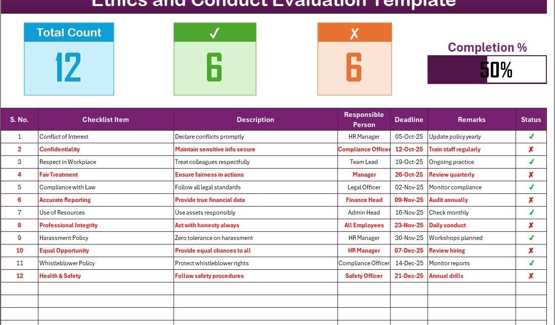 This checklist is more than just a document—it is a tool that helps track accountability, evaluate ethical behavior, and promote a culture of integrity. With Excel’s flexibility and automation features, the checklist becomes interactive, easy to update, and highly useful for HR teams, compliance officers, and managers.