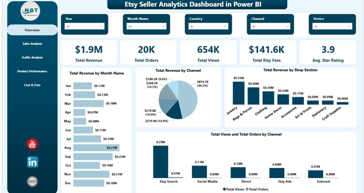 • 5 Interactive Dashboard Pages – Overview, Sales Analysis, Traffic Analysis, Product Performance, and Cost and Fees provide a complete 360-degree view of your Etsy shop performance.