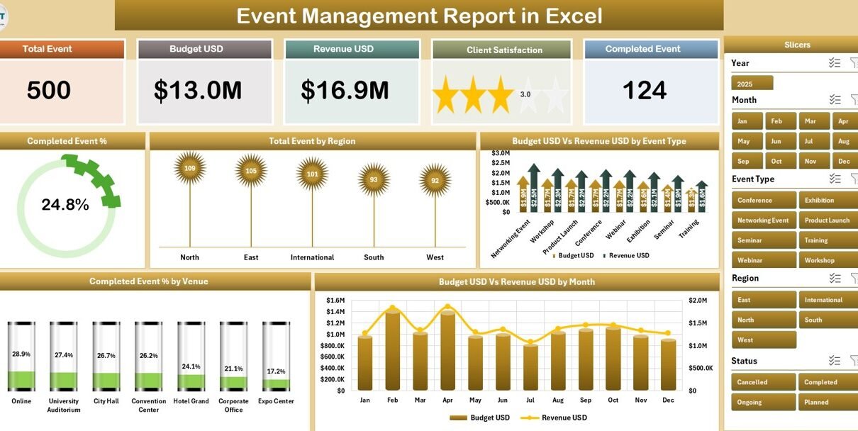 💎 Available in other formats: if Excel is not your preferred platform, the same event analytics also exist as a Event Management Analysis Dashboard in Excel, an Event Management Analysis Dashboard in Power BI, and an Event Management Analysis Dashboard in HTML.