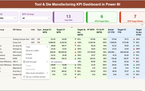 - Displays KPI Group, Unit, Type (Lower the Better or Upper the Better), Formula, and Definition.