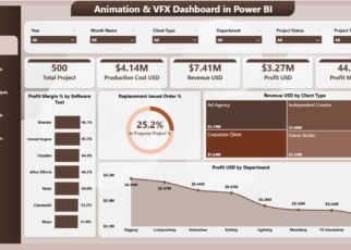 An Event Production Dashboard in Excel is an essential tool for event planners, production teams, and agencies. It helps you manage events with better accuracy, speed, and clarity. The dashboard includes multiple analysis pages that display event performance, venue insights, client patterns, and monthly trends. With clear visuals and structured reporting, event managers gain complete control over the event lifecycle.