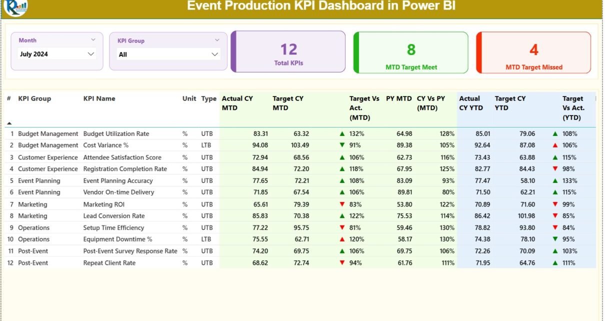 An Event Production KPI Dashboard in Power BI gives you complete control over event operations. It brings all KPIs into one interactive platform and helps you make faster and more accurate decisions. With simple slicers, arrows, MTD–YTD indicators, and trend charts, this dashboard becomes the backbone of your event production planning. When you update the Excel file regularly, you receive instant insights that support better event management, resource planning, and performance improvement. As a result, your events run smoother, faster, and with fewer errors.