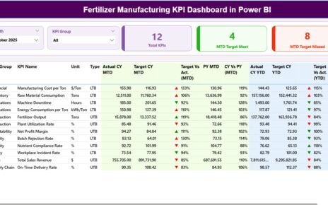 The Summary Page works as the main page of the dashboard. It brings all KPI details together for fast analysis. You can select the Month and KPI Group using slicers at the top. This helps you filter the information within seconds.