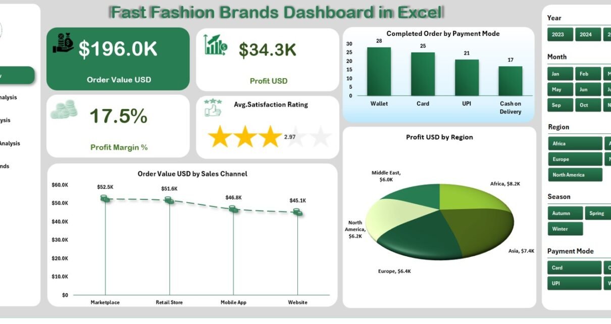 A Fast Fashion Brands Dashboard in Excel is a dynamic and interactive performance analysis tool designed specifically for fashion retailers. It brings together key performance indicators (KPIs) related to orders, payments, profits, customer ratings, and discounts.