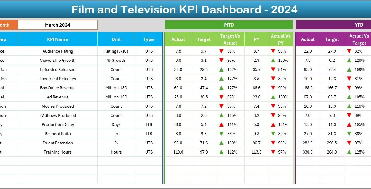 A Film and Television KPI Dashboard is a pre-built Excel template designed to track and analyze the most important performance metrics for media production companies, broadcasters, streaming platforms, and studios. Instead of juggling between complex business intelligence tools or raw spreadsheets, this dashboard organizes KPIs into structured visuals, charts, and reports.