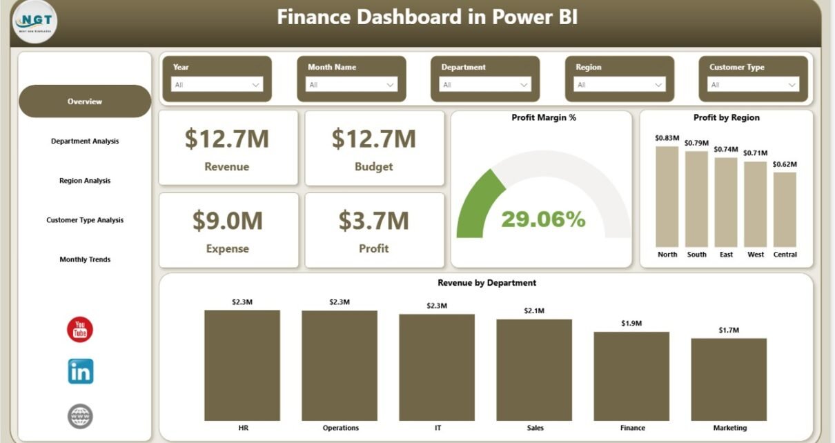 Through five analytical pages — Overview, Department Analysis, Region Analysis, Customer Type Analysis, and Monthly Trends — businesses achieve complete financial visibility.