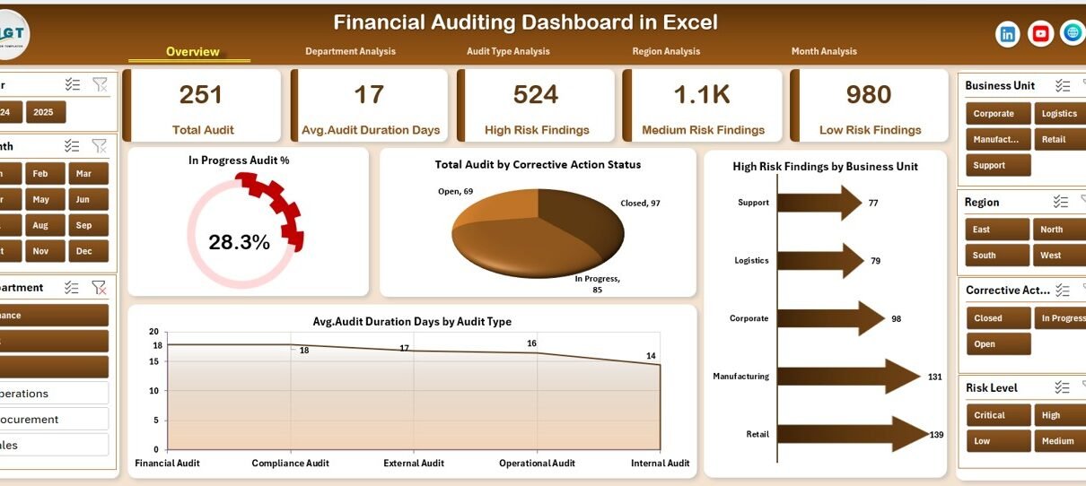 A Financial Auditing Dashboard in Excel is an interactive reporting and monitoring tool that helps organizations track audit activities, findings, risks, and performance metrics using visual charts and KPI summaries.