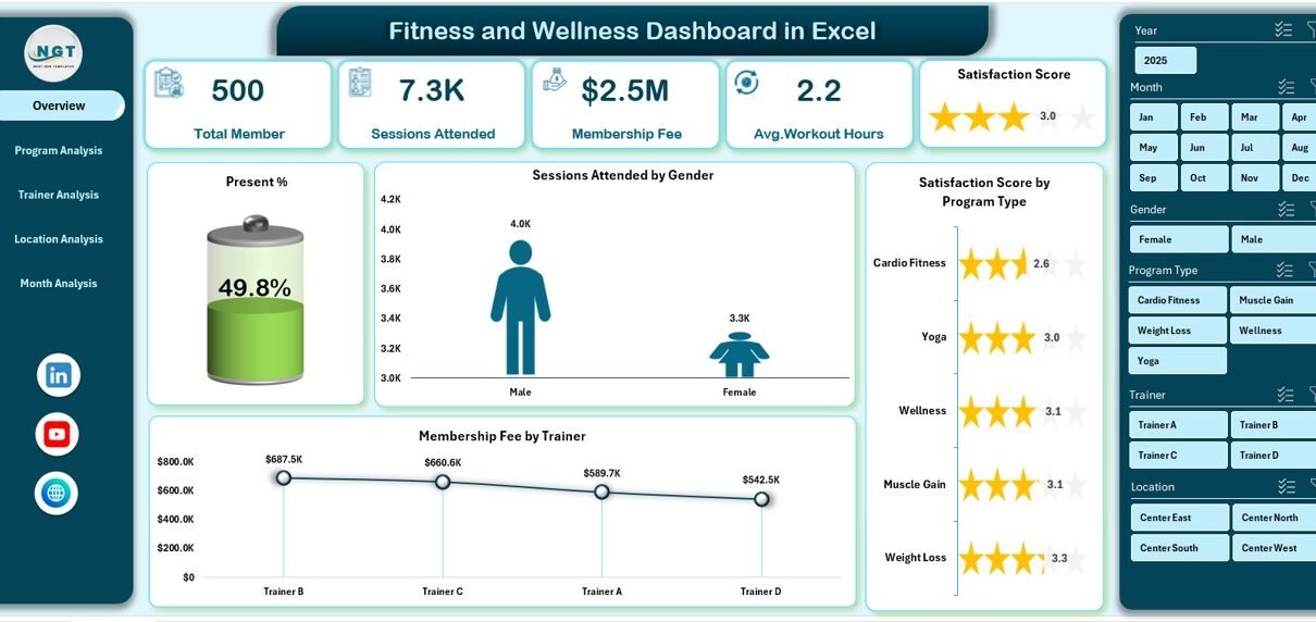 A Fitness and Wellness Dashboard in Excel transforms raw fitness data into meaningful insights. Instead of juggling multiple reports, users gain one powerful view of performance, engagement, satisfaction, and revenue.